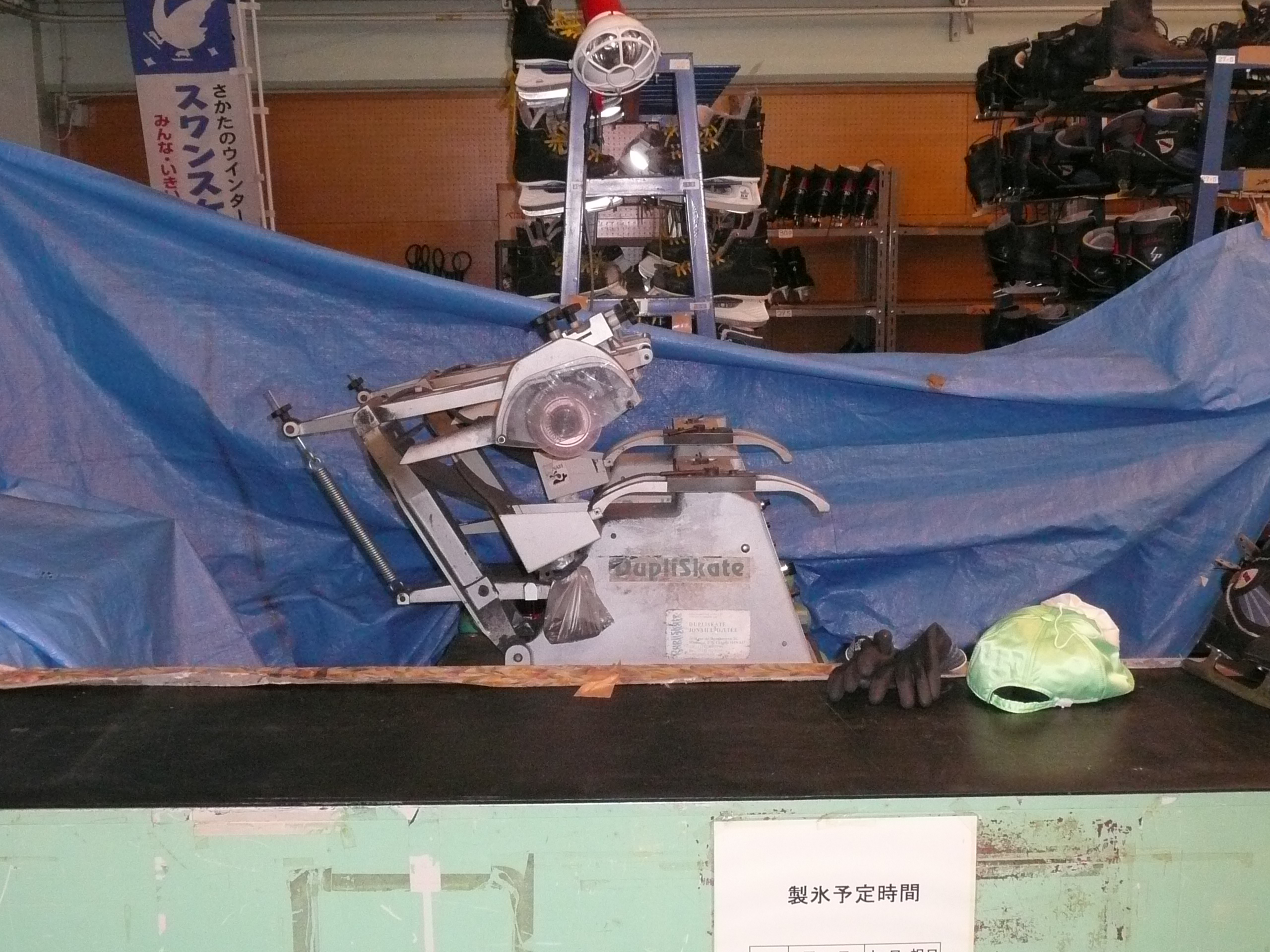 日中に2回、深夜は1時間半おきに霧状に散水して凍らせます。散水しては凍らせ散水しては凍らせてという作業をほぼ不眠不休で続けます。スワンスケートリンクの氷はとても滑りやすく、県内外からスケーターが訪れるとのことでしたが、それもそのはず。なんと氷の層は1㎜。1㎜の層を何層も何層も重ねて8㎝ほどの厚みを持ったリンクを作っていくというのです。その間、氷を作る冷凍機に負荷をかけすぎると止まってしまうので、氷を溶かさないようにつきっきりで冷凍機の温度管理をしながら見守ります。氷の状況や機械の状況について細心の注意を払って行うこの結氷作業を、富樫様はスワンスケートリンク開設以来、実に26年間続けて来られたのです。専門家ならではのお仕事ぶりとスケートにかける情熱には驚くばかりです。