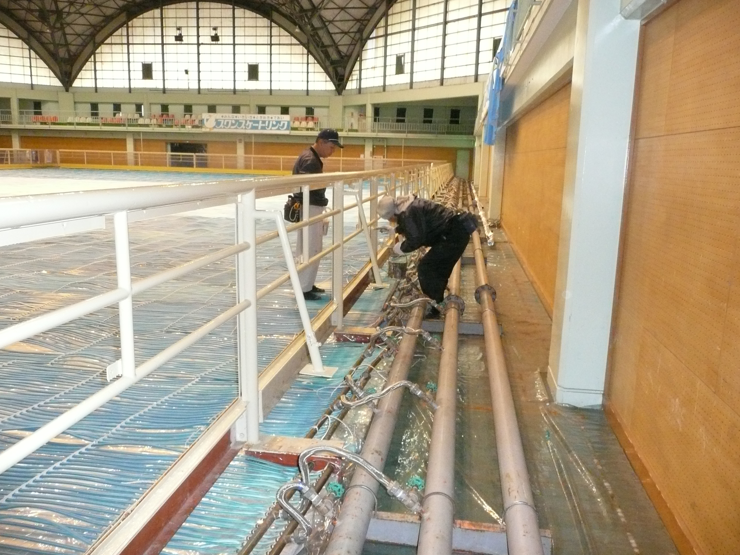 まず、リンクの心臓部の冷凍機。体育館の南側のプレハブに2機設置されています。この冷凍機で冷やされたブライン液(液体)が、リンクサイド(西側)の太い配管を通って、写真のようにリンクいっぱいにU字型に張り巡らされた青色のブライン管に流れていきます。このブライン液の冷凍効果で水か凍っていくわけですが、とりわけ細心の注意を払うのが、このブライン管に散水しながら昼夜を通して行われる結氷作業です。