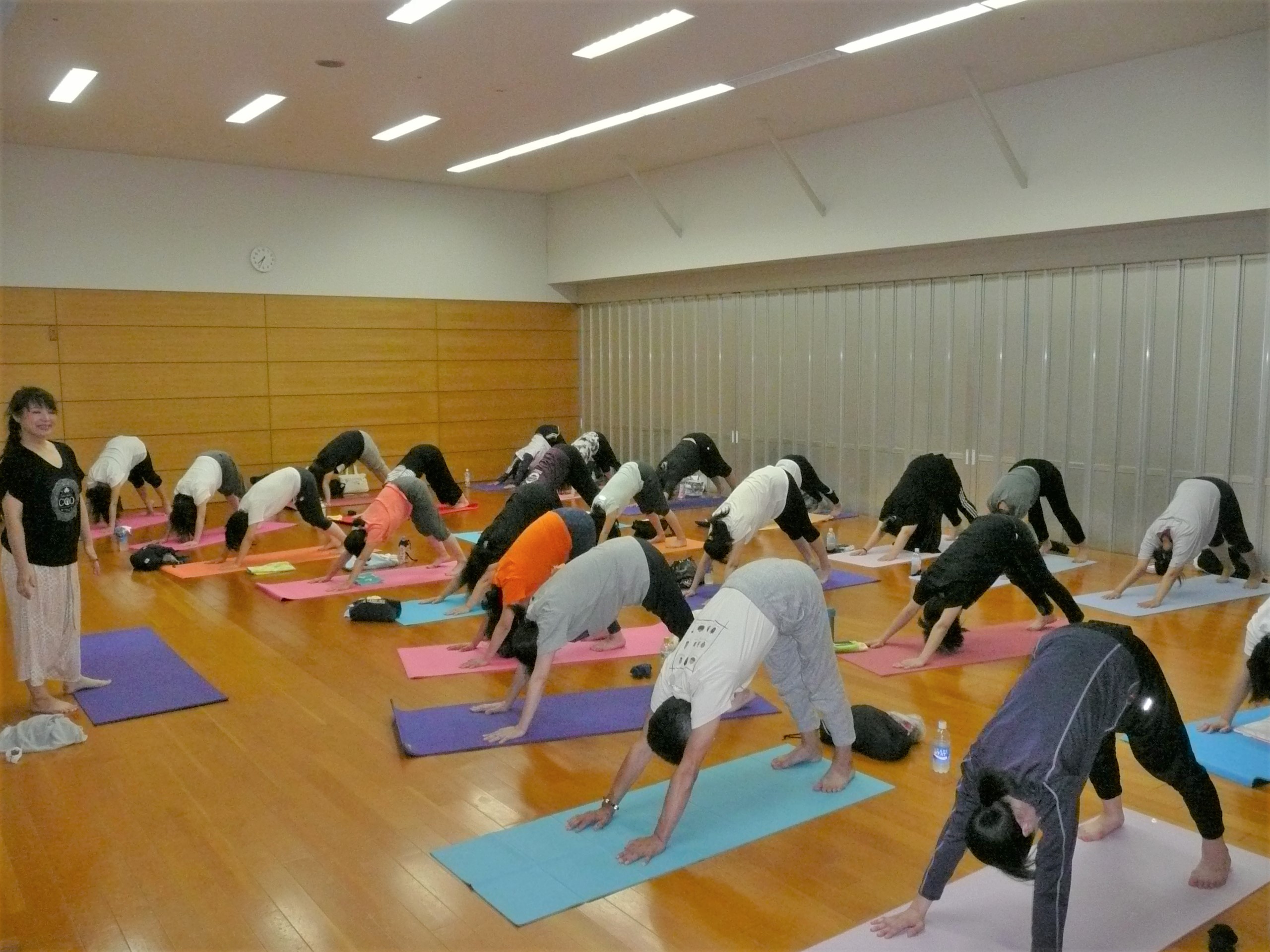 第1回目の講座は「リフレッシュヨガ」。ビューティボックスの佐藤明美さん(IHTA認定ヨガインストラクター)にご指導をいただきました。