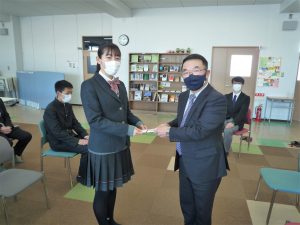 12月10日(金)に行われた本会の令和3年度第2回強化専門委員担当理事会において、今年度の特別強化事業として数多くの個人・チーム団体が指定されました。そのうち、酒田南高等学校陸上競技部、ソフトテニス部、女子サッカー部、及び酒田光陵高等学校陸上競技部、男子剣道部に対し、1月21日に各校にお伺いし本会斎藤隆会長、荘司敏博専務理事より特別強化費を交付いたしました。